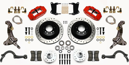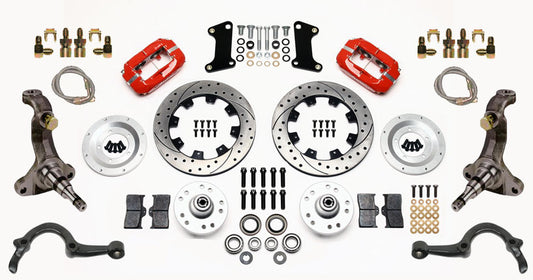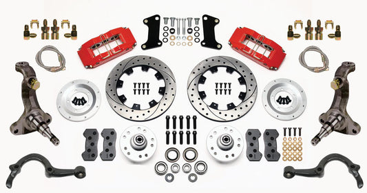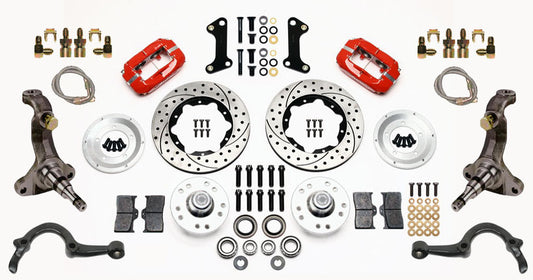64-72 A-BODY DISC BRAKE & STOCK HEIGHT SPINDLE KIT,11" DRILLED ROTOR,RED WILWOOD