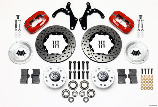 55-57 CHEVY FULL DISC BRAKE KIT,11" DRILLED ROTORS,RED CALIPERS