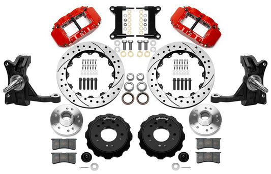 71-87 CHEVY C10 FULL DISC BRAKE KIT & WILWOOD IRON DROP SPINDLES,12" DRILLED,RED