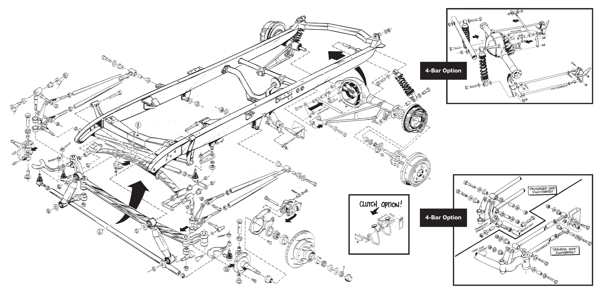 - These front suspension packages make it easier to begin transforming your Model A frame into a rolling chassis. Kit includes a 48" axle, 27" radius rods, leaf spring and shackles, lower shock mounts and hardware