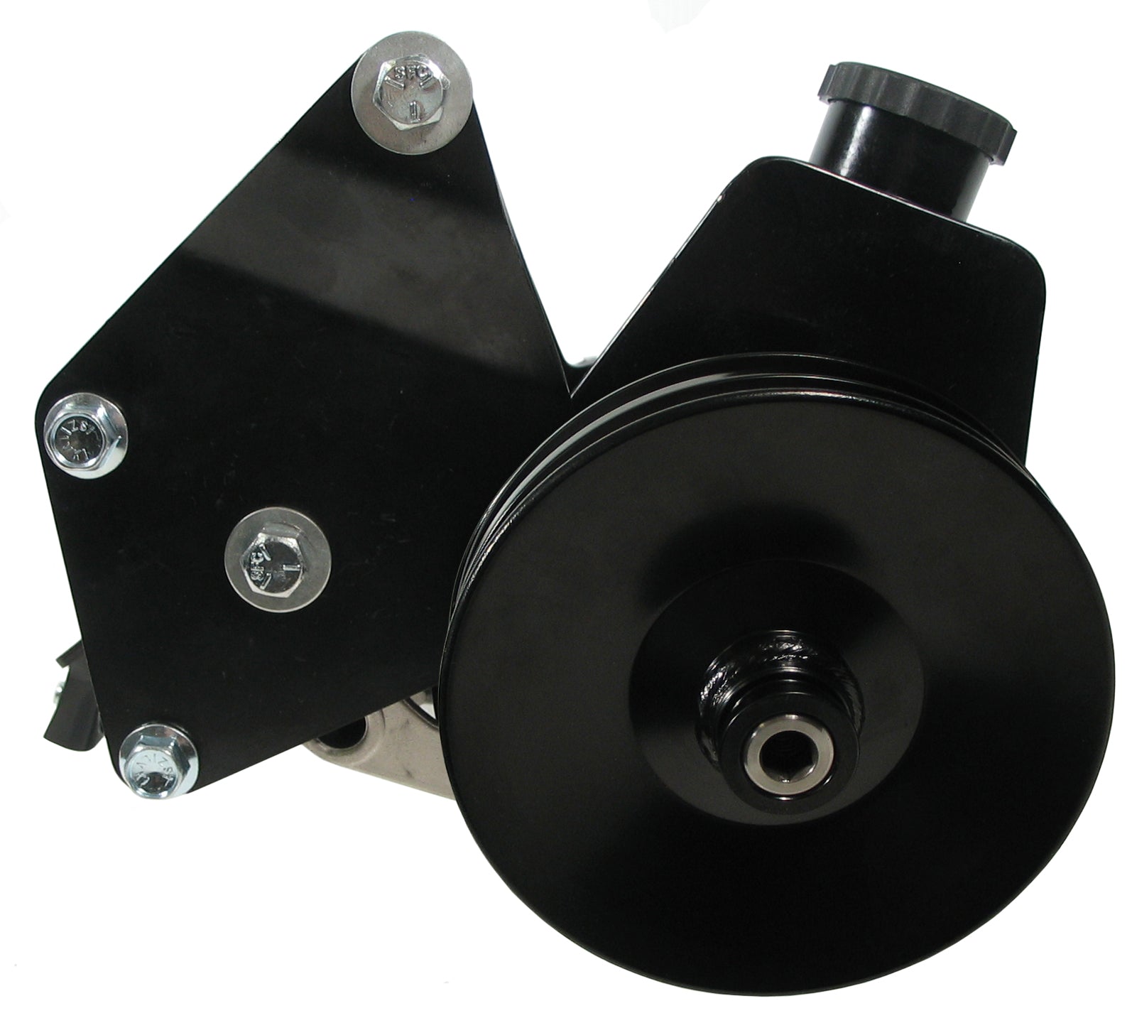 SOUTHWEST SPEED 1400 SERIES PERFORMANCE POWER STEERING PUMP WITH DOUBLE GROOVE V-BELT PULLEY & SMOG BRACKET ASSEMBLY (SWS PART #149-1812). PRODUCED BY SOUTHWEST SPEED INC.