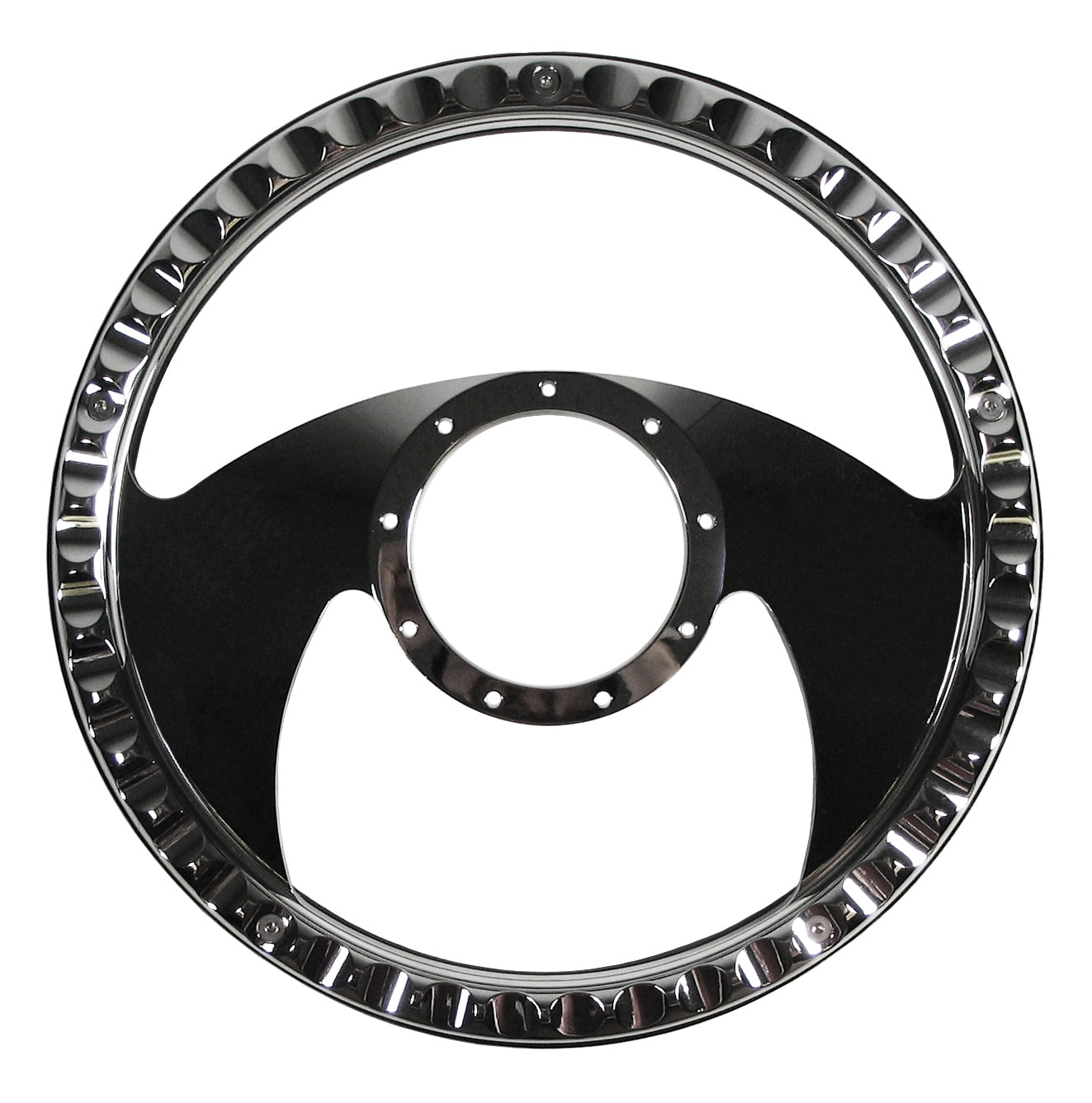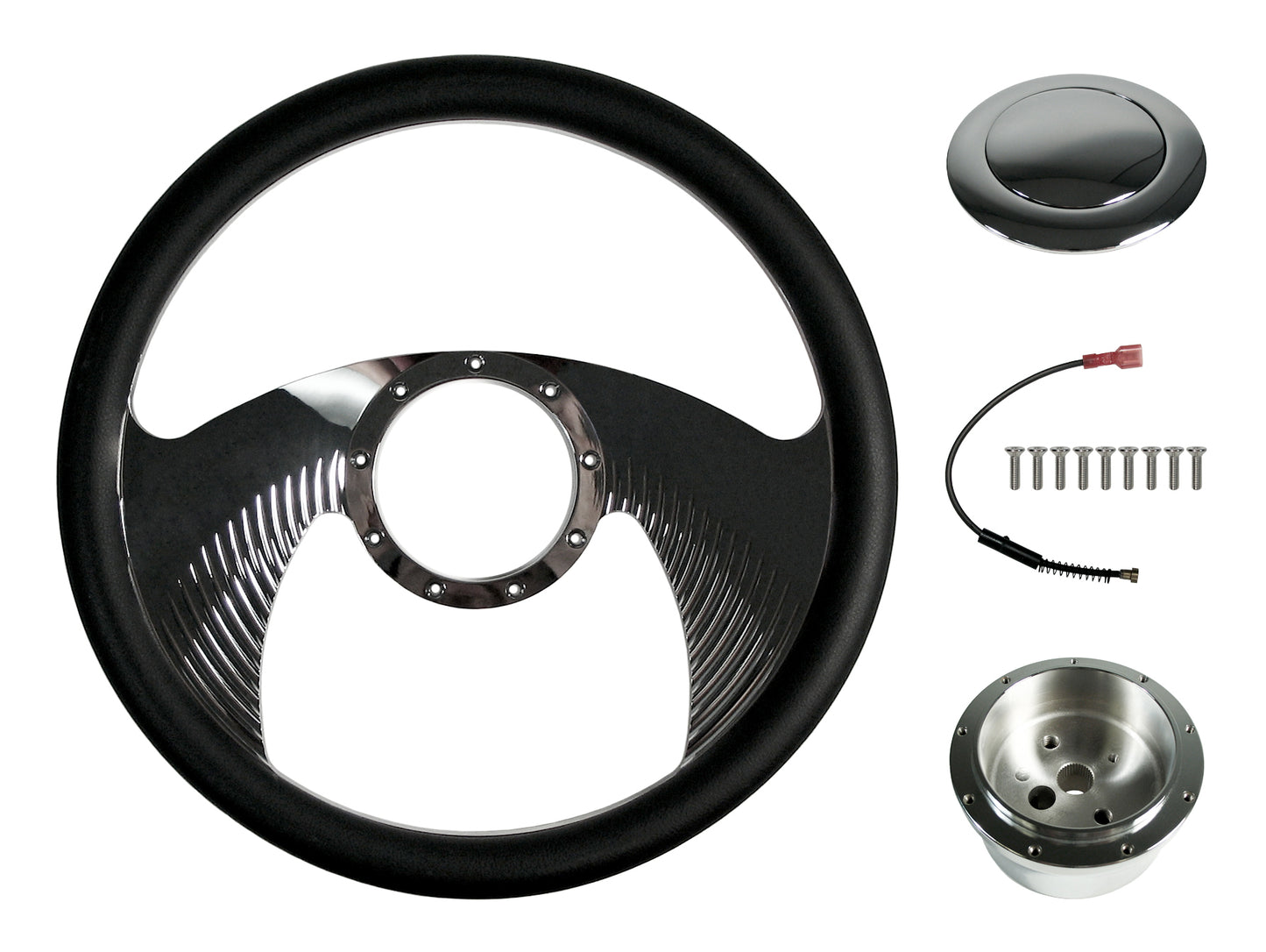 This stylish 14" inch steering wheel features a half wrap, leather grip design, 2" dish, and chrome plated billet aluminum spokes. Wheel has a 9-bolt mounting pattern requiring a hub adapter to install on your GM style column.