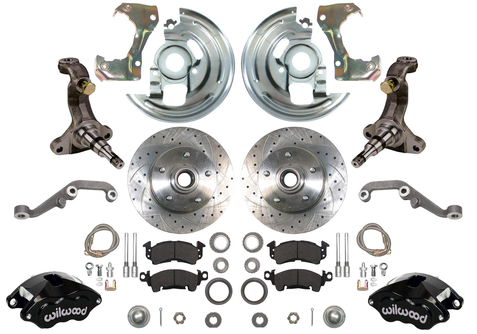 62-67 X-BODY DISC BRAKE & STOCK HEIGHT SPINDLE KIT,11" DRILLED ROTORS,BLACK WIL