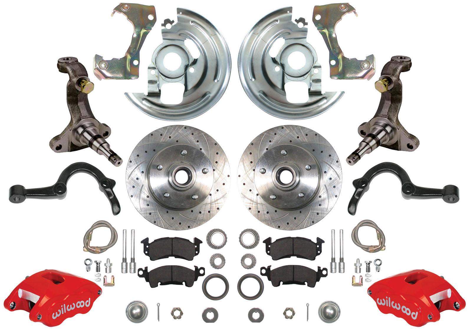 DRILLED & SLOTTED ROTORS, AS WELL AS POWDER-COATED RED WILWOOD CALIPERS.