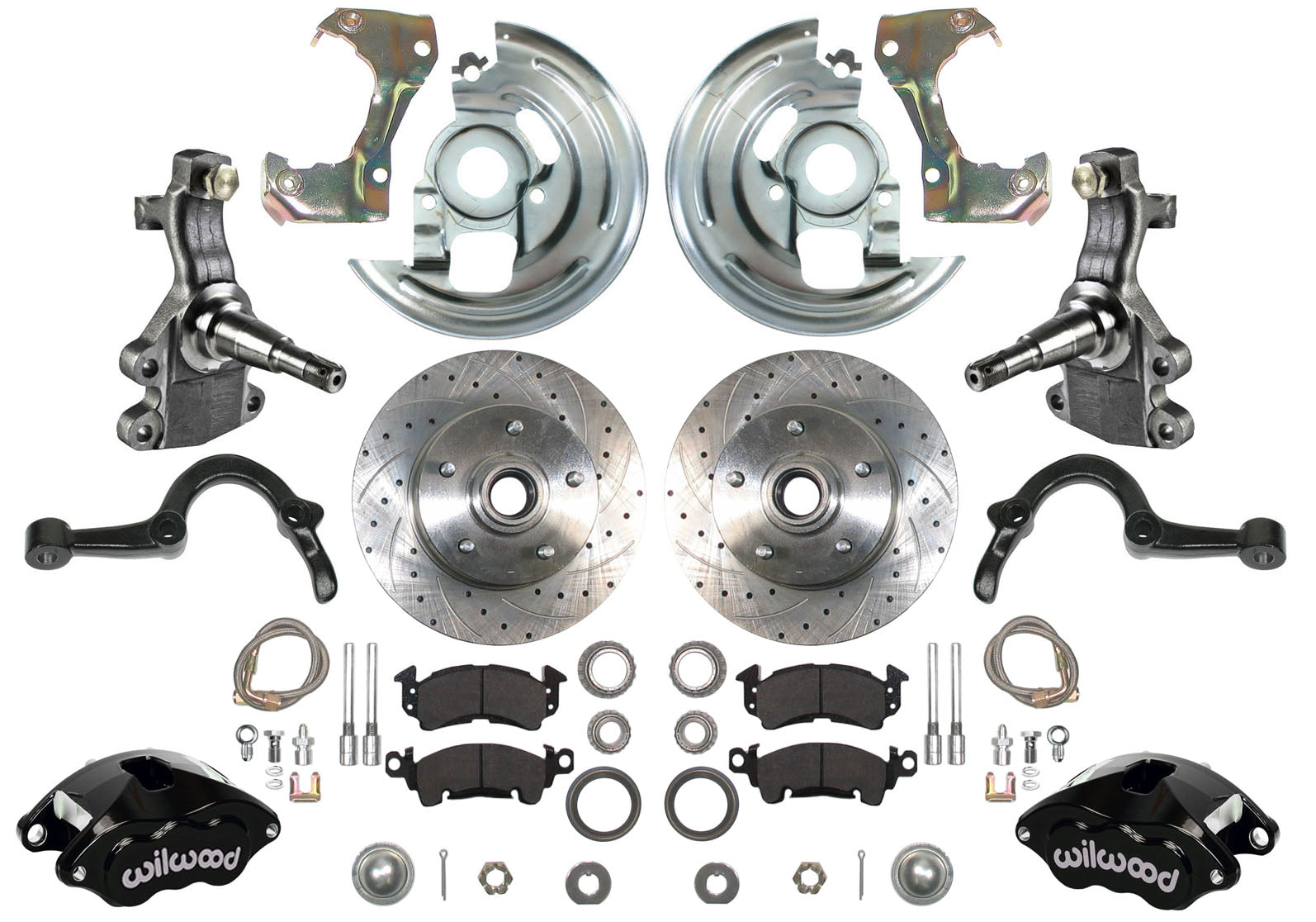 64-72 A-BODY DISC BRAKE & 2" DROP SPINDLE KIT,11" DRILLED ROTORS,BLACK CALIPERS