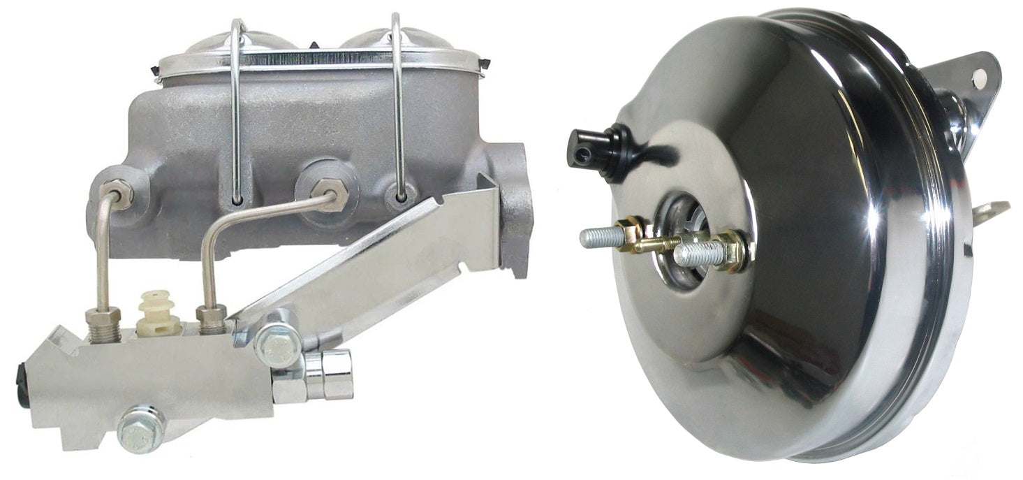 This kit features a single diaphragm brake booster, tandem chamber master cylinder, and proportioning valve kit. This particular kit is typically used on vehicles with front discs and rear drums. We also have kits for disc/disc applications.