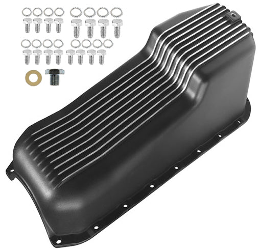 OIL PAN,FINNED ALUM,SBC,55-79,LEFT-HAND DIPSTICK,BLACK