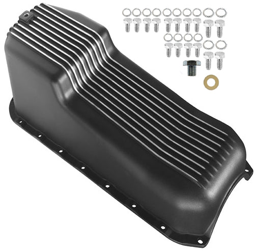 OIL PAN,FINNED ALUM,SBC,86+,RIGHT-HAND DIPSTICK,BLACK