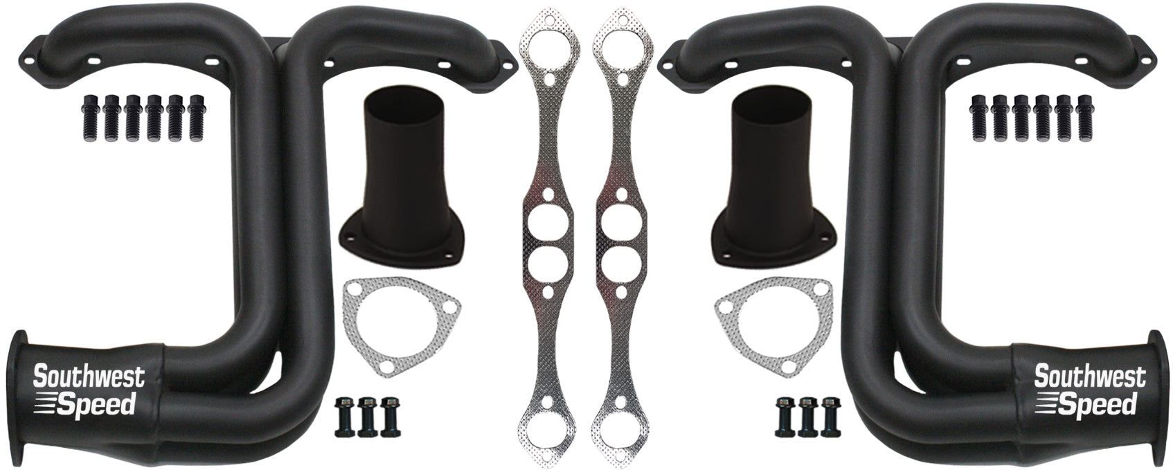 • THIS PAIR OF SOUTHWEST SPEED FORD CHASSIS HEADERS ARE GREAT FOR HOT RODS, STREET RODS, RAT RODS & NOSTALGIA RODS, AND ARE HOTTER THAN EVER, AND NOTHING GIVES YOUR STREET ROD THAT AUTHENTIC COMPETITION LOOK & FULL-LENGTH HEADER PERFORMANCE LIKE A SET OF CHASSIS HEADERS. THESE HEADERS WILL FIT INSIDE THE FRAME RAILS ON 1928-1934 FORD CHASSIS, & CAN BE BE USED WITH NEARLY ANY OIL FILTER SYSTEM, TRANSMISSION, & STARTER COMBINATION. THESE ARE A GREAT CHOICE FOR MOST ANY ROADSTER WITH A SMALL BLOCK CHEVY ENGINE. SUPPLIED WITH 1 1/2" PRIMARY TUBES WITH 3" COLLECTORS, AND COMES COMPLETE WITH HEADER BOLTS AND GASKETS AND REDUCER BOLTS AND GASKETS. FEATURES .380" GROUND PARALLEL FLANGES ON THE CYLINDER HEAD SURFACE, AND INCLUDES A PAIR OF 3" TO 2 1/4" REDUCERS TO COMPLETE THE INSTALLATION. THESE HEADERS WILL FIT ANGLE PLUG OR STRAIGHT PLUG HEAD APPLICATIONS WITH NO SPARK PLUG OR SPARK PLUG WIRE RESTRICTIONS.