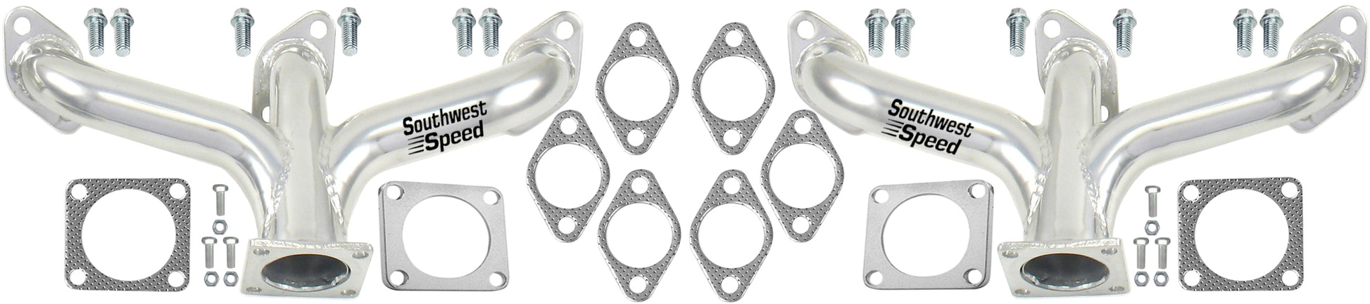 Brand New Pair of Southwest Speed Polished Stainless Steel Center Dump Headers for 1932-1953 Flat Head Fords with 136-255ci V-8 Engines (SWS Part #440-2460).