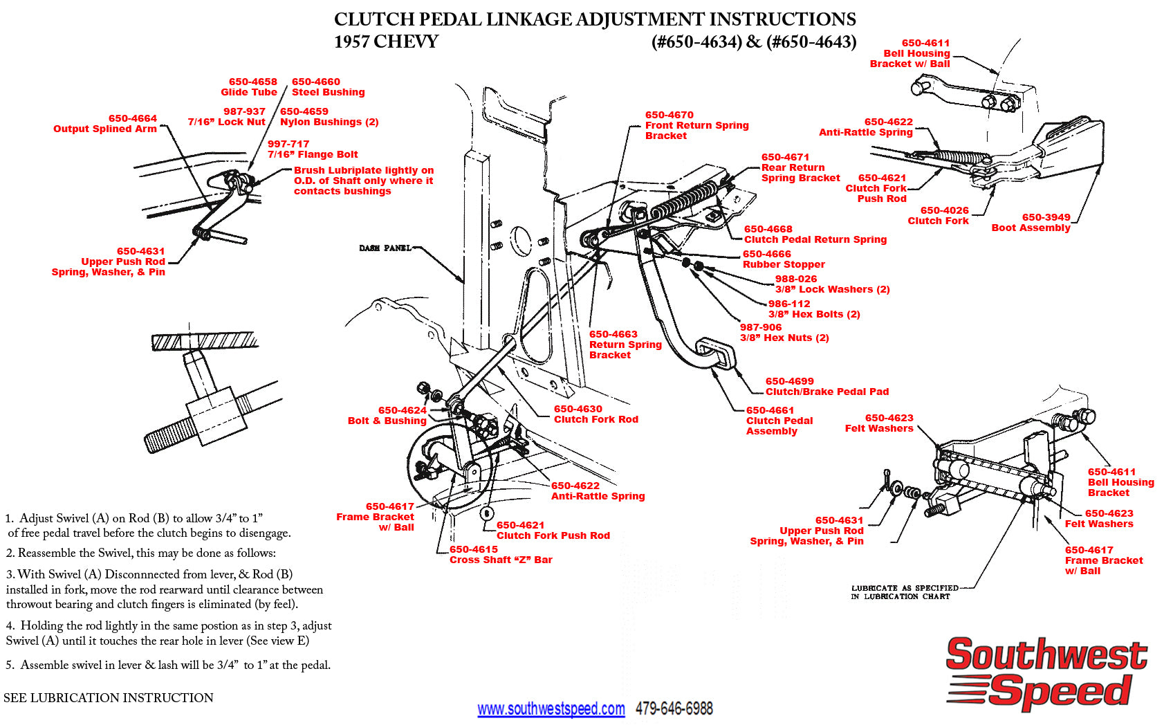 YOU CAN VIEW AND DOWNLOAD THE COMPLETE 1957 CHEVY CLUTCH LINKAGE ADJUSTMENT INSTRUCTIONS WITH DETAILED CLUTCH PEDAL & LINKAGE DIAGRAM HERE.