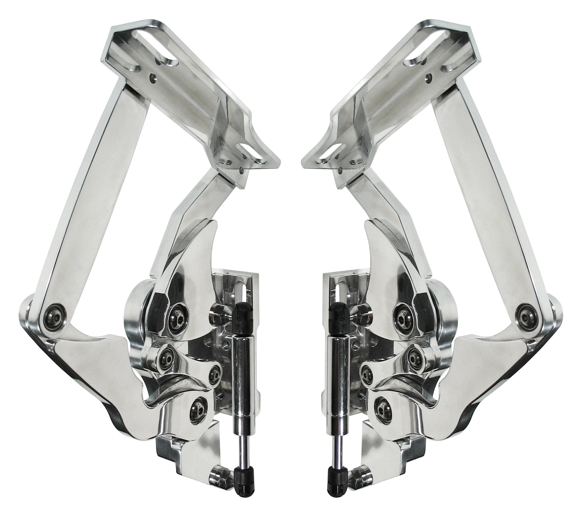 - BRAND NEW PAIR OF (LEFT & RIGHT) POLISHED ALUMINUM SOUTHWEST SPEED BILLET HOOD HINGES WITH GAS SPRINGS THAT FIT 1957 CHEVY CARS WITH FIBERGLASS & CARBON FIBER HOODS.