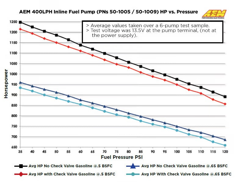 AEM's 400LPH High Flow, High-Pressure Fuel Pump (AEM 50-1005) is capable of supporting over 1,200 HP normally aspirated and a whopping 860 HP at 30 psi boost!* It flows 400LPH (100 gph) at 40 PSI, 340LPH (90 gph) at 73 PSI, and 270LPH (71 gph) at 120 PSI. Complete flow curves from 35 to 120 PSI and current draw vs. fuel pressure charts are available in the Specs tab.