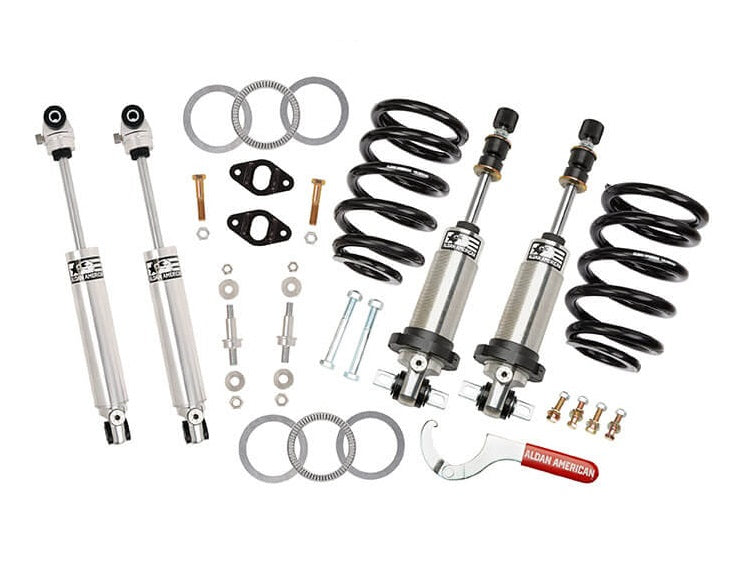 Upgrade your front suspension to coilovers and rear suspension to adjustable shock absorbers with Aldan American Suspension Kits. Aldan kits include either single adjustable or double adjustable front coilovers and rear shocks. Made in the U.S.A. Aldan coilovers are designed for an OEM like fitment that offer greater tunability and a wide range of ride height adjustment for the ultimate in suspension handling and performance. Aldan coilovers are easy to install and include everything you need to bolt-on to your factory, or aftermarket control arms. Front coilovers from Aldan will lower 0.0-2.0″ when installed. Rear, adjustable shocks included will work with factory rear shock mounts and offer a superior ride when compared to conventional shock absorbers. Aldan coilovers and shocks are factory serviceable and fully rebuildable. If you are looking to achieve the perfect stance as well as gain a smoother, more consistent ride – Check out our complete Suspension Kits from Aldan American.