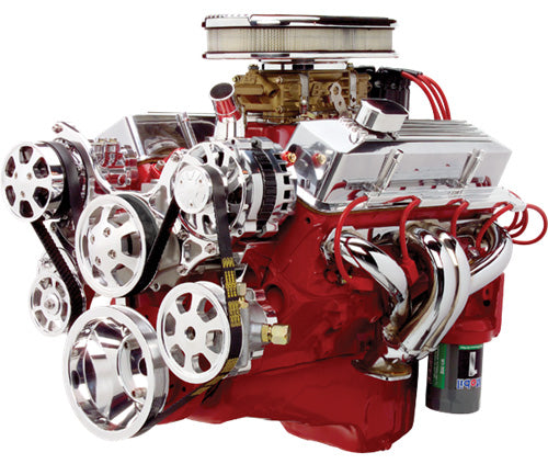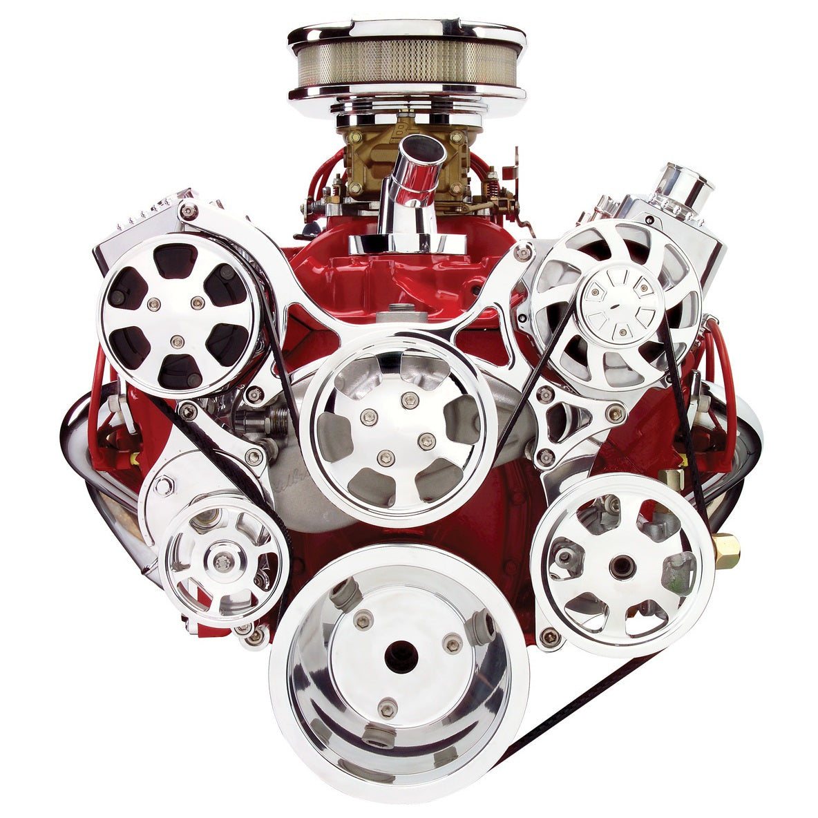 Brand New Front Engine Serpentine Pulley Set for Small Block Chevy's with Water Pump, Alternator, A/C Compressor, Power Steering Pump, and More. This kit is produced by Billet Specialties Inc. (Part #13220).