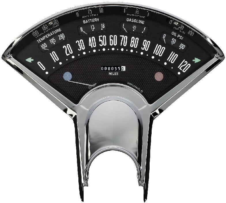 THE BEL ERA III DIRECT-FIT PACKAGE OFFERS THE PERFECT COMBINATION OF ALL-ELECTRIC TECHNOLOGY AND THE NOSTALGIC STOCK LOOK OF 1955-56 CHEVY. BUILT WITH AN INJECTION MOLDED HOUSING AND DUAL-LAYER DESIGN, IT PROVIDES A SPEEDOMETER, FUEL GAUGE, OIL, TEMP, AND VOLT GAUGES ALL IN ONE EASY-TO-INSTALL CLUSTER. NEW TO THE BEL ERA III IS A FUEL SENDER SELECTOR SWITCH TO EASILY CHOOSE THE CORRECT RESISTANCE RANGE DURING INSTALLATION.