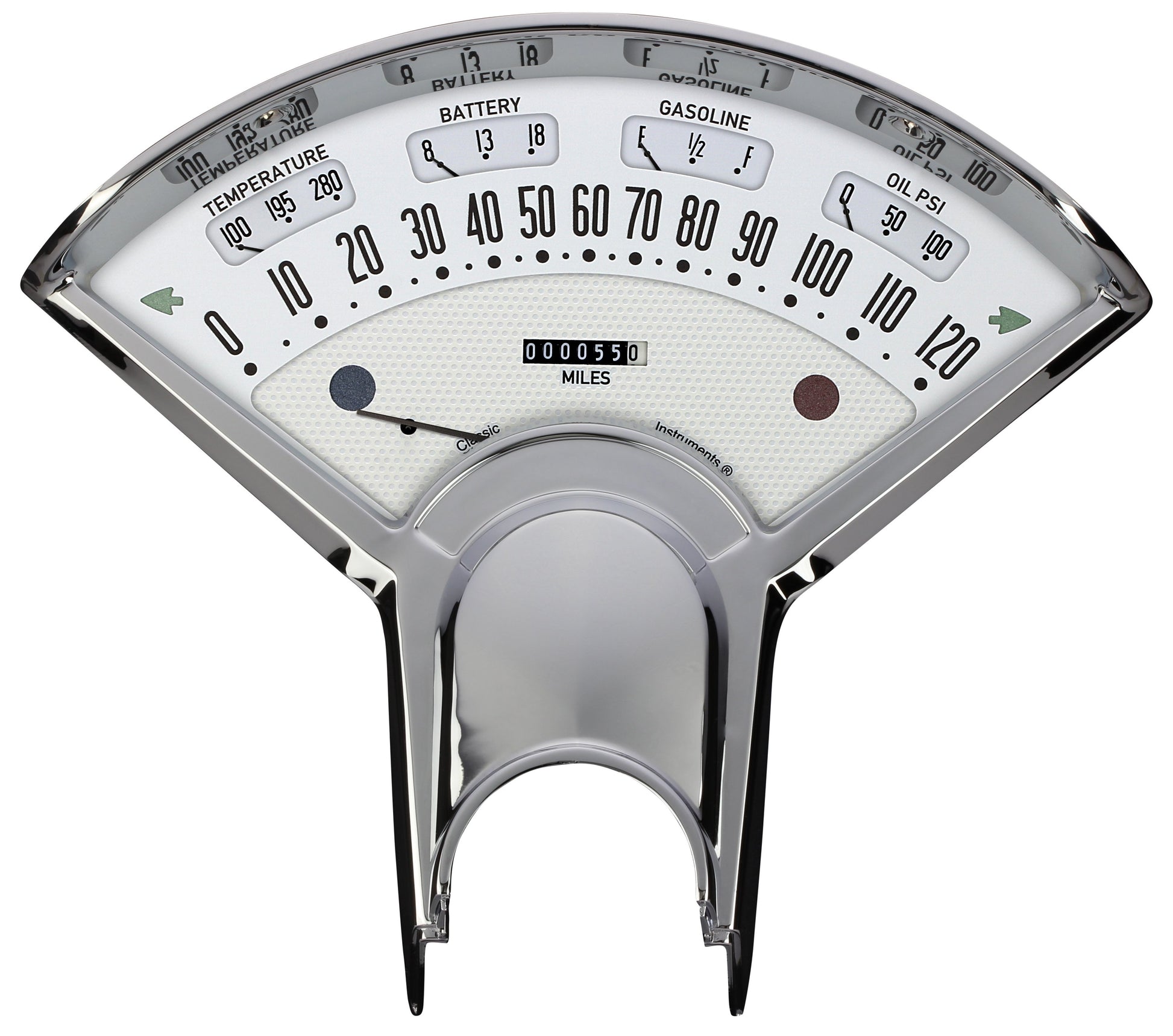 THE BEL ERA III DIRECT-FIT PACKAGE OFFERS THE PERFECT COMBINATION OF ALL-ELECTRIC TECHNOLOGY AND THE NOSTALGIC STOCK LOOK OF 1955-56 CHEVYS. BUILT WITH AN INJECTION MOLDED HOUSING AND DUAL-LAYER DESIGN, IT PROVIDES A SPEEDOMETER, FUEL GAUGE, OIL, TEMP, AND VOLT GAUGES ALL IN ONE EASY-TO-INSTALL CLUSTER. NEW TO THE BEL ERA III IS A FUEL SENDER SELECTOR SWITCH TO EASILY CHOOSE THE CORRECT RESISTANCE RANGE DURING INSTALLATION.