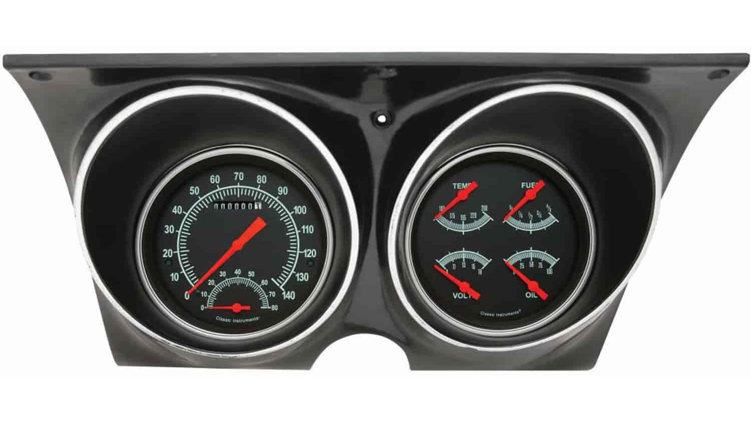 The G-Stock 1967-1968 Camaro instrument cluster is assembled in premium quality OER production dash bezel. The set includes a 4 5/8" SpeedTachular (with built-in ECM filter signal switch and LED turn signals in the face) and quad gauge with temp, volt, oil pressure, and fuel gauge programmed to read the stock 0-90 OHM fuel sender. The package is ready to bolt into your dash, complete with all necessary sending units, mounting hardware, and wiring harness constructed of automotive grade TXL wire, machine-crimped terminals, tech-flex sleeving, and Molex main connectors. It is equipped with our ZST™ and works directly with ECM or VSS signals so no additional control box is needed.