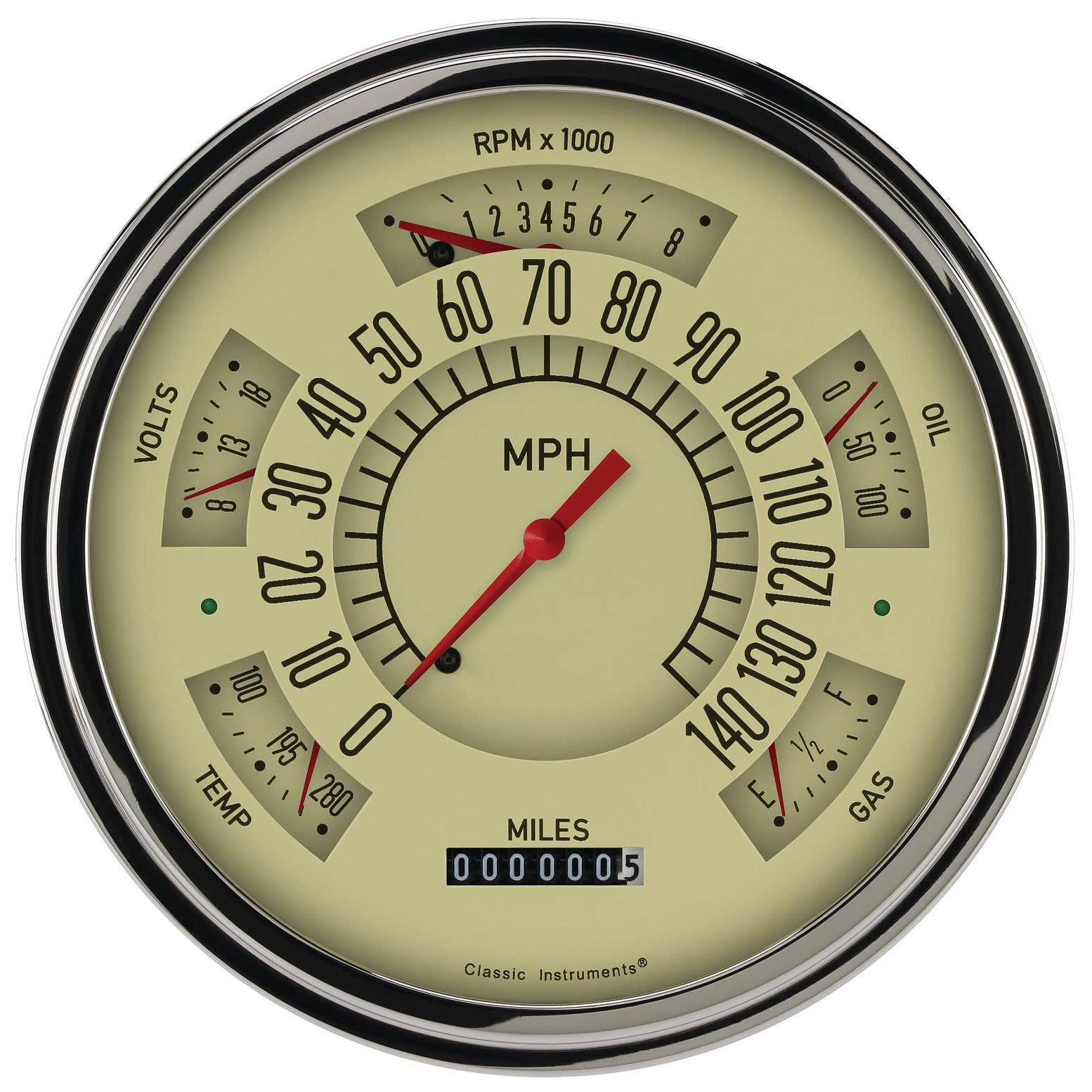 The 1949-1950 Chevy Package features the speedometer, tachometer, fuel, temperature, volt, and oil gauges all in one direct fit instrument. Installing the all-electronic cluster is easy with the included mounting hardware, Classic Instruments' Zeus Speedometer Technology™ for push button calibration, and all the included sending units.