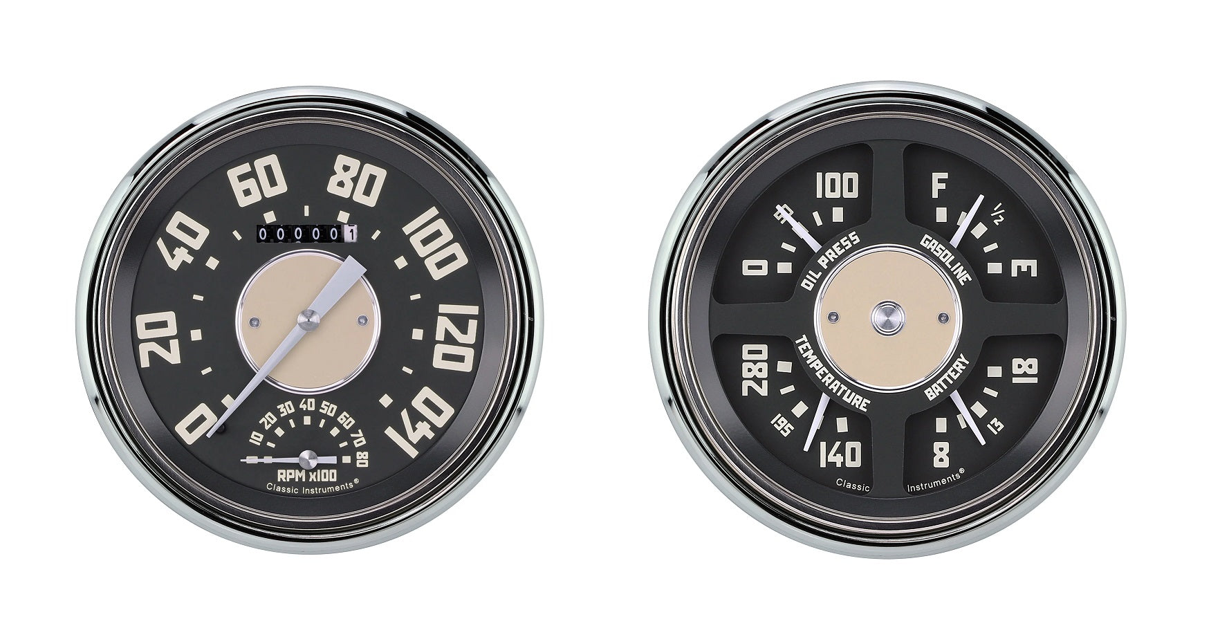 1947-53 Chevy Truck Package features an all new style designed to replicate the OE look. Billet aluminum center medallions and factory correct colors bring that retro look back into your truck while maintaining gauges that function with today's technology. It has a 4 5/8" Speedtachular (Speedo/Tach combination gauge) and Quad (Fuel, Oil, Temp, Volt combination gauge) with stainless low step bezels and flat glass lenses. This package is also available with our 4 5/8" standard speedometer in place of the Speedtachular.