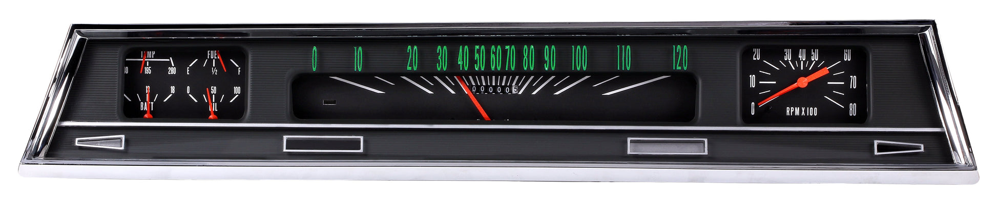 THE 1966-67 CHEVELLE DIRECT-FIT CLUSTER IN BLACK FEATURES A SPEEDOMETER AND TACHOMETER, AND FUEL, OIL, TEMPERATURE, AND VOLT GAUGES. THE ALL-ELECTRIC CLUSTER ARRIVES READY TO INSTALL DIRECTLY INTO THE STOCK DASH OF 66-67 CHEVELLES, WITH EASE. ADDITIONALLY, THE TURN SIGNALS AND HIGH BEAM INDICATOR ARE IN THE STOCK LOCATIONS AND IT ALSO FEATURES A BUILT-IN SHIFT LIGHT AND WARNING LIGHT. EVERYTHING NEEDED TO INSTALL THE PACKAGE IS PROVIDED IN THE KIT INCLUDING ALL NECESSARY SENDING UNITS. IT FEATURES OUR ZST™ AND WORKS DIRECTLY WITH ECM OR VSS SIGNALS REQUIRING NO ADDITIONAL CONTROL BOXES. THE CLUSTER IS DESIGNED TO REUSE THE STOCK FUEL SENDING UNIT OR ANY AFTERMARKET FUEL SENDER (PURCHASED SEPARATELY) WITH THE BUILT-IN OHM RANGE SELECTOR SWITCH. WHETHER YOU WANT TO FRESHEN UP YOUR STOCK LOOK, OR CALL US FOR CUSTOMIZATIONS TO MAKE IT YOUR VERY OWN, OUR 1966-67 CHEVELLE DIRECT-FIT CLUSTER OFFERS THE PERFECT SEAMLESS INSTALLATION YOU DESIRE.
