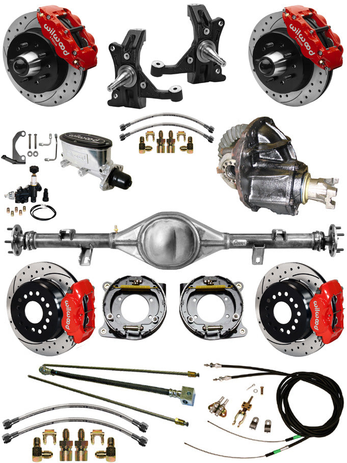 This specific set features 2" Drop Spindles and Wilwood brakes with 12" Front & 12" Rear Drilled Rotors and Red Calipers.