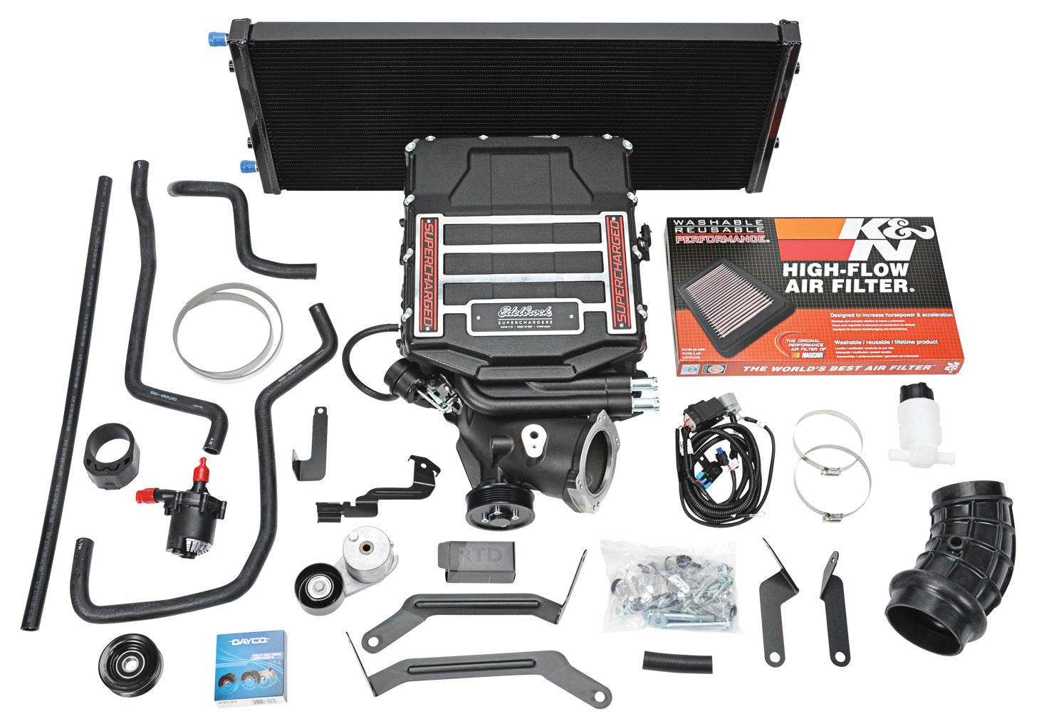 Installation of the Edelbrock Supercharger requires no cutting or modifications and fits neatly under the stock hood. If you're concerned about the effect on MPG, the increase in power comes with little to no loss in fuel economy during normal driving thanks to the system’s integrated bypass valve that mitigates parasitic power loss. This is a true bolt-on kit that requires no additional modifications to the stock 6.2L engine. The Edelbrock Supercharger features a self-contained lubrication system with a 100,000-mile service interval and a patented high-capacity Dual-Pass 3-Core (DP3C) intercooler. The durable black powder-coating blends nicely with the engine and results in an attractive under hood presentation that looks like the factory put it there. Each kit includes a complete set of preformed hoses, hardware and a full-color manual that provides clear step-by-step instructions for ease of installation. Unlocking of the factory PCM is included in this kit.