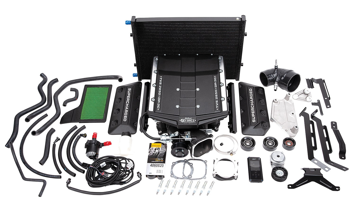 Are you ready to add serious horsepower under the hood of your 2018-21 Ford Mustang GT? The Edelbrock Supercharger Kit is a 50-state emissions-legal system that is dyno-proven to produce 623 horsepower and 510 ft-lbs of torque to the rear wheels with no other modifications required! That means no cutting to stock body or hood so your car retains the stock hood and cowl. At the heart of this system is Eaton's biggest R2650 TVS rotor assembly housed in a new manifold with an integrated high-capacity DP3C (dual-pass, three-core) air-to-water intercooler for lower inlet air temperatures and increased power potential. The 170-degree high-twist lobes, bigger bearings and beefier timing gears ensure maximum reliability with smooth acceleration throughout the powerband.