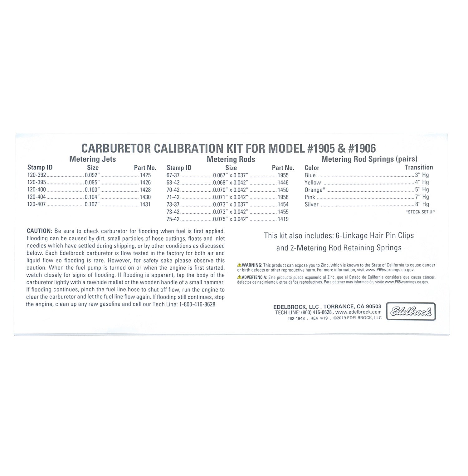 Brand New Edelbrock AVS2 Series Carburetor Calibration Kit. Designed For #1905 or #1906 Carburetor (Part #1948).