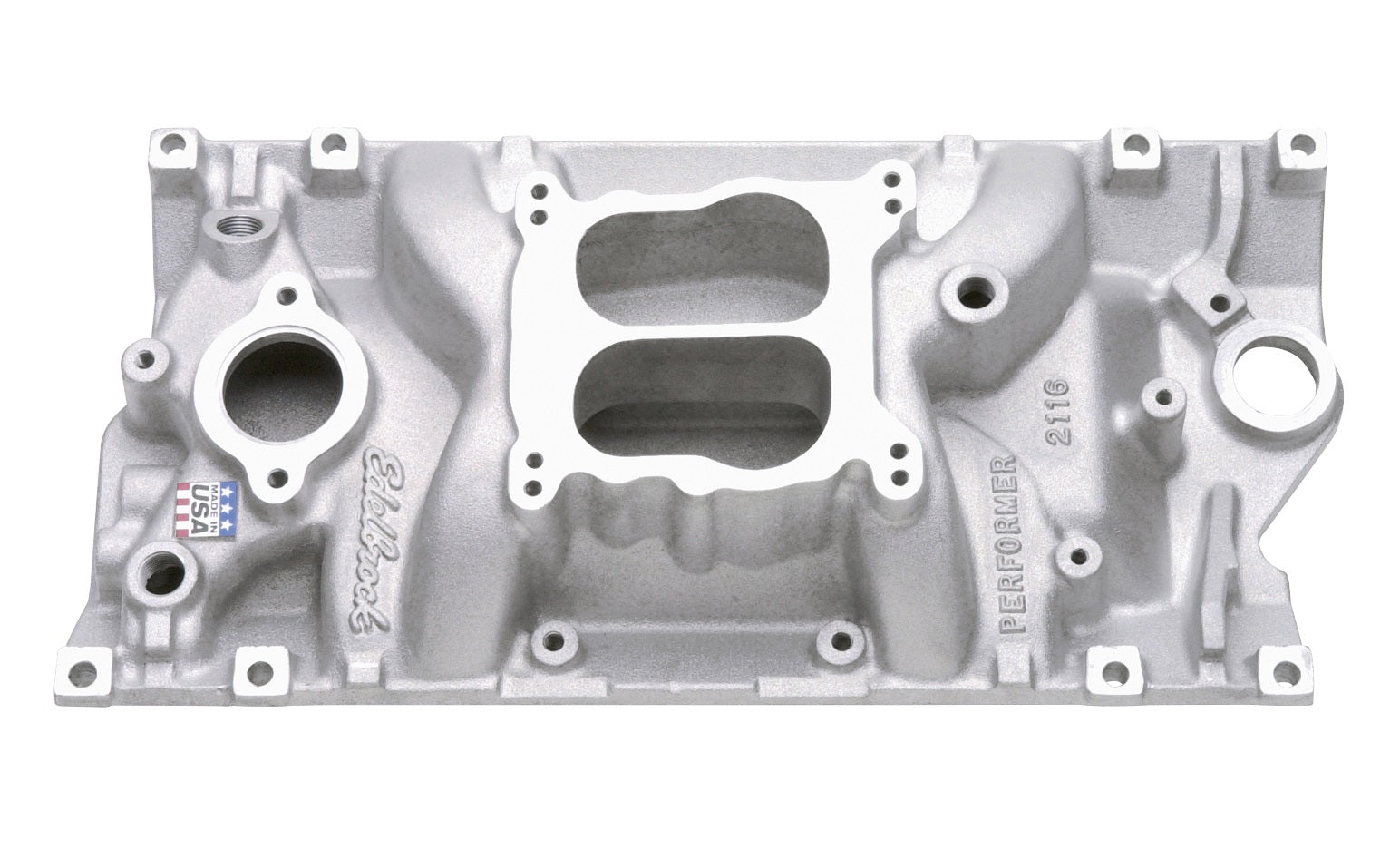 Edelbrock part #2116 Performer intake manifold is based on the popular and powerful Edelbrock #2101, this dual-plane intake is designed for the street rod, industrial and engine swap market utilizing 262-400 c.i.d. Chevy V8's with 1996 and later Vortec (L31) cast iron or the Edelbrock E-Tec aluminum heads. Edelbrock's Patented Dual-plane, low-rise design with a 180-degree firing order greatly improves torque over a wide rpm range for excellent throttle response from off-idle through 5500rpm. Manifold has provisions for external water bypass and may be used on either Vortec blocks or 1995 and earlier blocks. No provision for exhaust heated chokes.