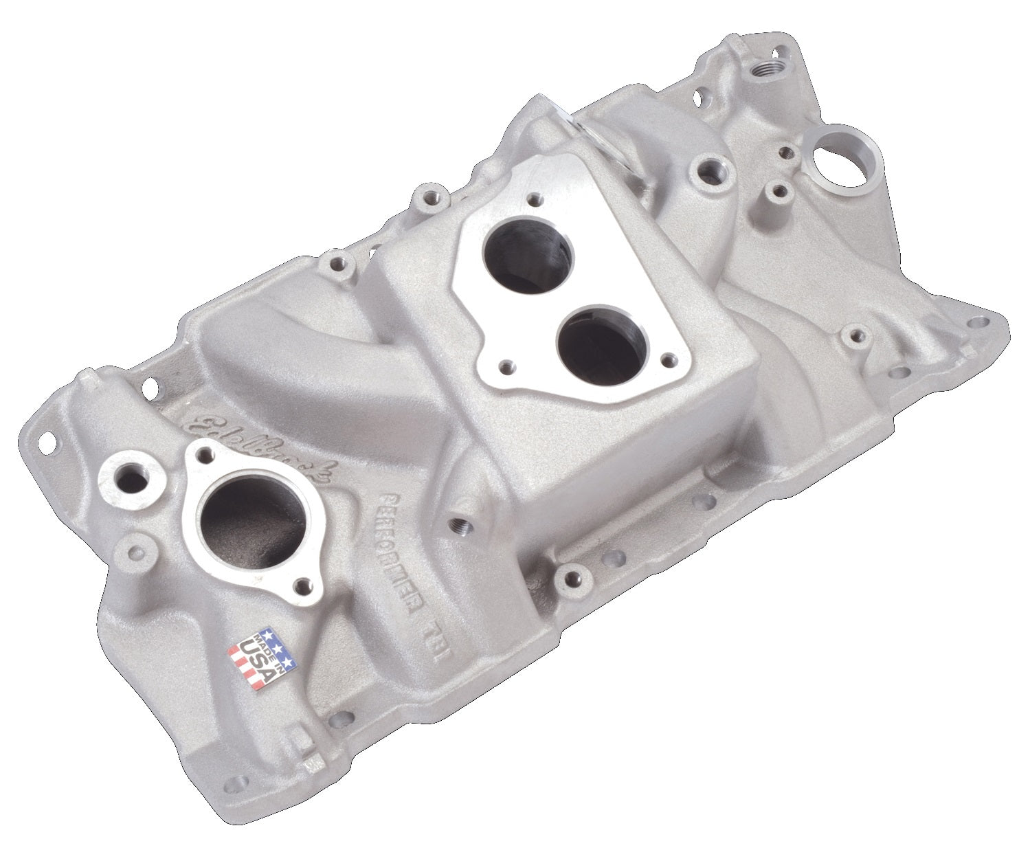 Edelbrock Performer T.B.I. intake manifold is designed for 1987-95 305/350 C.I.D. 5.0/5.7L Chevy throttle body injected engines. Accepts all OEM equipment and small-bore (1-11/16") throttle body injectors only. Will not fit Caprice or Buick and Cadillac "B" bodies.