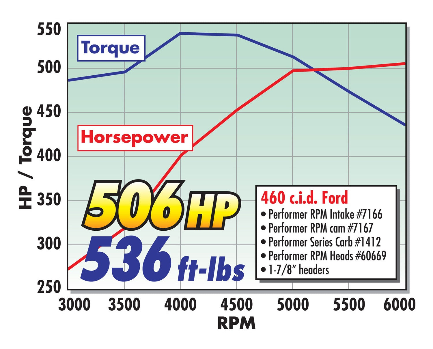 Edelbrock part #7167 Performer RPM Camshaft is designed for Ford 429-460 V-8 applications. This Edelbrock cam kit produced 506 HP & 536 ft-lbs. of torque when used with #7166 intake and #60669 cylinder heads on a 460 engine. The camshaft works well with high-performance's street applications, Performer RPM cams provide power from 1500 to 6500 rpm. This hydraulic lifter camshaft is dyno-matched to Performer RPM manifolds for high-rpm horsepower while still maintaining acceptable low-end torque. With 10 to 12 inches of manifold vacuum at idle, Performer RPM cams have more lift and duration than most street camshafts. Hydraulic flat tappet lifters are included with each Performer RPM camshaft.