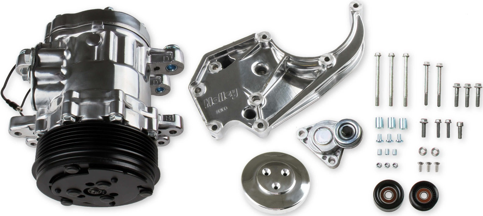 BRAND NEW HOLLEY LS A/C ACCESSORY DRIVE KIT, POLISHED FINISH, INCLUDES SD7 A/C COMPRESSOR, TENSIONER & PULLEYS, COMPATIBLE WITH GM LS ENGINES