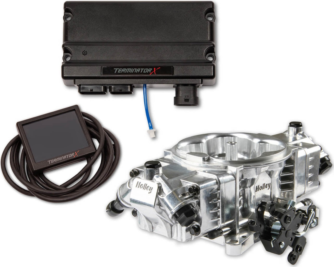 THE TERMINATOR X STEALTH 4150 EFI SYSTEM FROM HOLLEY FEATURES 4, 100LB/HR FUEL INJECTORS CAPABLE OF SUPPORTING UP TO 650 HP NATURALLY ASPIRATED OR 600 HP ON FORCED INDUCTION APPLICATIONS. THE TERMINATOR X ECU IS CAPABLE OF FUEL MAP SELF-LEARNING & IGNITION TIMING CONTROL, IMPROVING IDLE STABILITY, DRIVABILITY & WIDE-OPEN THROTTLE HORSEPOWER!