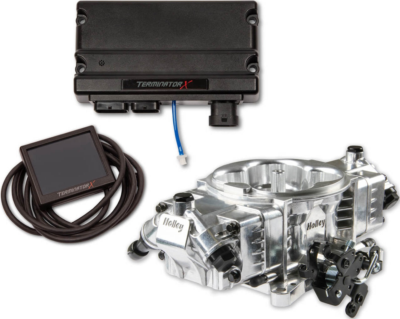 THE TERMINATOR X STEALTH 4150 1250HP EFI SYSTEM FROM HOLLEY FEATURES 8, 100LB/HR FUEL INJECTORS CAPABLE OF SUPPORTING UP TO 650 HP NATURALLY ASPIRATED OR 1250 HP ON FORCED INDUCTION APPLICATIONS. THE SYSTEM IS CAPABLE OF FUEL MAP SELF-LEARNING & IGNITION TIMING CONTROL, IMPROVING IDLE STABILITY, DRIVABILITY & WIDE-OPEN THROTTLE HORSEPOWER! THE STEALTH 4150 INCLUDES TRANSMISSION KICK DOWN PROVISIONS FOR GM TH350/400, 200R4/700R4 & FORD C4/C6 APPLICATIONS.