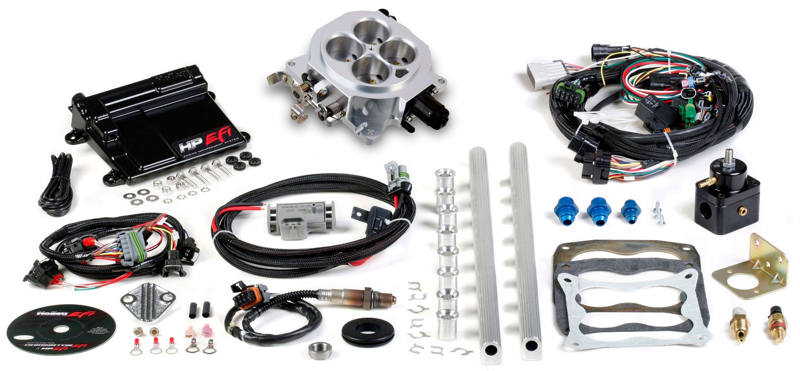 DO YOU HAVE A MOPAR, FORD OR OTHER TYPE ENGINE YOU WANT TO INSTALL MULTI-PORT FUEL INJECTION ON? THE HOLLEY HP UNIVERSAL MPI RETROFIT EFI KITS ARE DESIGNED TO BE USED WITH ANY V-8 INTAKE MANIFOLD. THE KIT COMES WITH INJECTOR BUNGS AND UN-MACHINED FUEL RAILS SO YOU CAN MODIFY TO FIT ANY SINGLE PLANE 4BBL INTAKE MANIFOLD. THE HP UNIVERSAL RETROFIT KITS ALSO COME WITH THE NECESSARY WIRING, ECU, SENSORS AND THROTTLE BODY. JUST SELECT THE FUEL PUMP AND INJECTORS OF CHOICE AND YOU ARE OFF AND RUNNING.