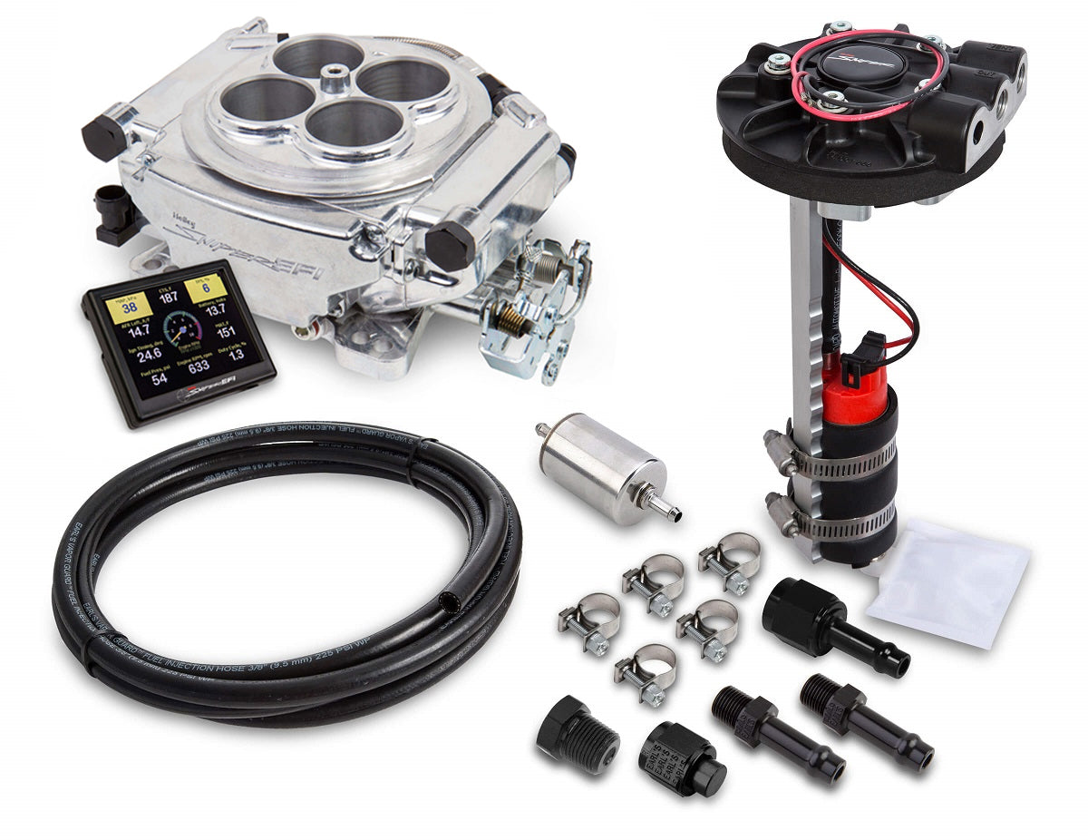 ARE YOU WAITING TO CONVERT YOUR CARBURETED VEHICLE TO SNIPER EFI, BUT DO NOT LIKE THE IDEA OF MOUNTING AN EXTERNAL FUEL PUMP? LOOK NO FURTHER. INTRODUCING SNIPER EFI MASTER KITS, WITH A RETURNLESS RETROFIT FUEL MODULE. THIS CONTAINS COMBINES THE SNIPER EFI SELF LEARNING THROTTLE BODY, WITH AN EASY TO INSTALL IN-TANK RETROFIT RETURNLESS MODULE, 20 FT OF EARLS VAPOR GUARD FUEL HOSE, AND THE REQUIRED FITTINGS. THE INCLUDED FUEL SYSTEM PLACES A 340 LPH FUEL PUMP IN THE TANK, WHICH CAN EASILY BE ACCOMPLISHED WITH BASIC HAND TOOLS. THE DROP-IN MASTER KITS MAKE PLUMBING YOUR SNIPER EFI INSTALLATION AS HASSLE FREE AS POSSIBLE, SIMPLY CAP THE REGULATOR ON THE SNIPER EFI THROTTLE BODY WITH THE PROVIDED -6AN CAP, SAFELY ROUTE THE VAPOR GUARD FUEL LINE ALONG THE CHASSIS BACK TO THE DIECAST FUEL HAT, AND THE JOB IS FINISHED.