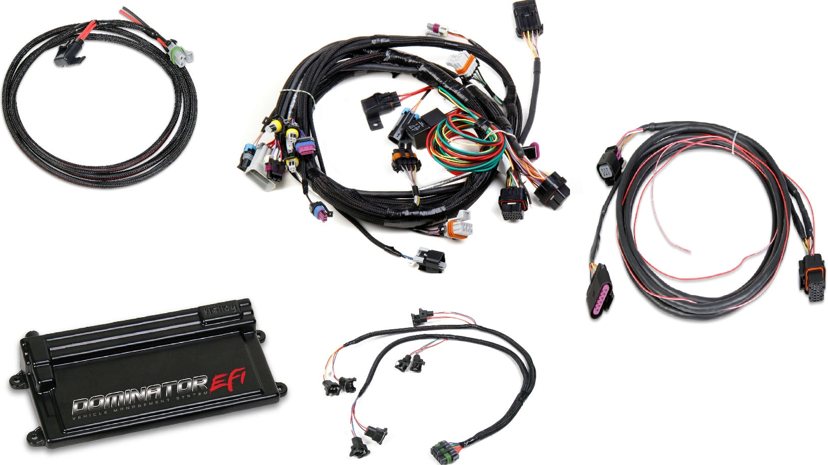 DOMINATOR EFI BASE KITS COME IN SEVERAL PRODUCT VARIATIONS TO FIT MOST POPULAR DOMESTIC V8 ENGINE APPLICATIONS SUCH AS; LS, SBC/BBC, SBF, BBF, AND CHRYSLER ENGINES KITS INCLUDE THE FOLLOWING: DOMINATOR ECU, USB CABLE, ECU POWER HARNESS, ENGINE MAIN HARNESS, EV1 INJECTOR HARNESS, BOSCH WIDEBAND, ECU MOUNTING HARDWARE INTEGRATED ELECTRONIC TRANSMISSION CONTROL - OPERATES GM 4L60E AND 4L80E TRANSMISSIONS, FORD AODE AND 4R70W WITH MORE TO COME IN THE FUTURE INTEGRATED DRIVE BY WIRE THROTTLE BODY CONTROL - CAN CONTROL TWO DRIVE BY WIRE THROTTLE BODIES. COMPATIBLE WITH A NUMBER OF DBW THROTTLE BODIES INCLUDING GM, CHRYSLER, FORD, AND NISSAN INTEGRATED DUAL CHANNEL WIDE BAND OXYGEN SENSOR CONTROLS - FOR MONITORING BOTH ENGINE BANKS (NTK OR BOSCH SENSORS) EXTENSIVE AMOUNT OF INPUTS AND OUTPUTS ALLOW FOR LIMITLESS COMBINATION OF OPTIONS. ALLOWS FOR UNIT TO BE USED AS A COMPLETE DATA ACQUISITION SYSTEM AS WELL INDIVIDUAL CYLINDER FUEL AND SPARK CONTROL ALLOWS YOU TO UNLOCK YOUR ENGINES POTENTIAL 1-7 BAR MAP SENSOR CAPABILITY - FOR NATURALLY ASPIRATED OR BOOSTED APPLICATIONS FUEL MAP AND LEARN FUNCTION SMOOTHING - HELPS TO SMOOTH ROUGH AREAS OF THE MAPS SELF-TUNING FUEL TABLE STRATEGY GREATLY SIMPLIFIES TUNING PROCESS - THE MORE YOU DRIVE IT, THE MORE IT LEARNS QUICK START STRATEGIES - FOR FASTER ENGINE STARTING ALLOWS FOR USE OF COMMON OEM SENSORS AS WELL AS CUSTOM SENSOR CALIBRATION INPUT TWO CHANNEL KNOCK CONTROL SENSOR INPUTS FOR BOTH ONE OR TWO WIRE KNOCK SENSORS STORE AND SELECT BETWEEN FOUR CALIBRATIONS WITH MULTI MAP SELECTOR (PART NUMBER 558-407) HARDWARE: