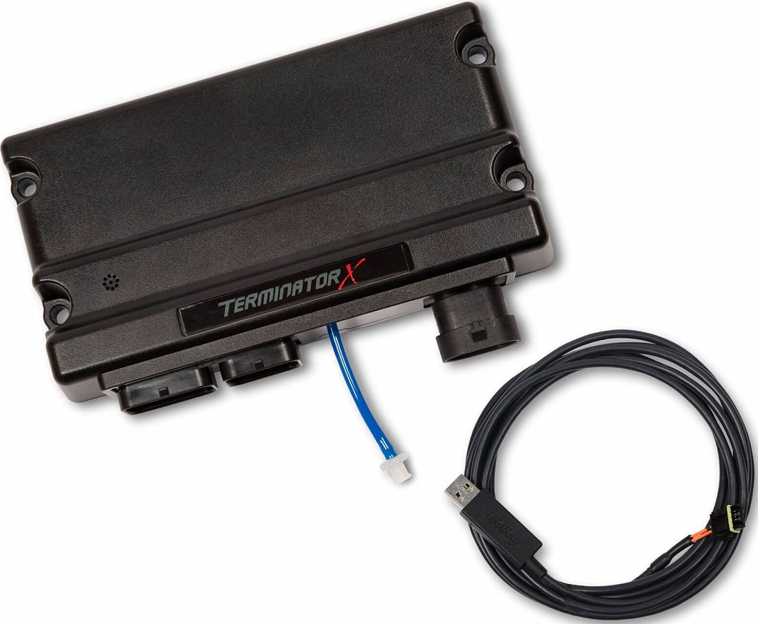 TERMINATOR X FEATURES REAL-TIME FUEL LEARN, HIGH IMPEDANCE INJECTOR DRIVERS, AN INTEGRATED 1BAR MAP SENSOR & 4 PROGRAMMABLE INPUTS/OUTPUTS. THE INPUTS/OUTPUTS ARE IDEAL FOR ELECTRIC FANS, BOOST CONTROL SOLENOIDS, PROGRESSIVE NITROUS CONTROL & MORE. TERMINATOR X COMES FULLY LOADED WITH BASE MAPS FOR COMMON LS ENGINE COMBINATIONS TO GET YOU OUT OF THE GARAGE & ON THE ROAD/TRACK FAST. THE 3.5" TOUCH SCREEN LCD HANDHELD CONTAINS AN EASY TO USE CALIBRATION WIZARD AS WELL AS TUNING & GAUGE DISPLAY FUNCTIONS. INCLUDED IS THE HOLLEY EFI INDUSTRY-LEADING, EASY TO USE SOFTWARE SUITE THAT ALLOWS FULL LAPTOP ACCESS FOR ADVANCED USERS.