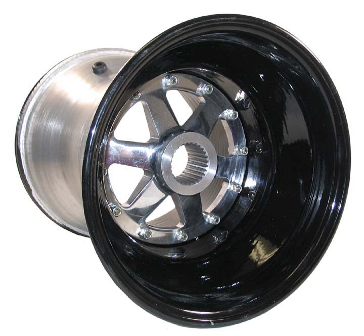 10" X 9" X 5" 10"(DIAMETER) X 9"(WIDTH) X 5"(INNER HALF) BLACK POWDERCOATED NON-BEADLOCK 12 BOLT 27 SPLINE POLISHED ALUMINUM CENTER MOST COMMONLY USED ON THE LEFT REAR OF MOST POPULAR 600CC MICRO SPRINT CHASSIS