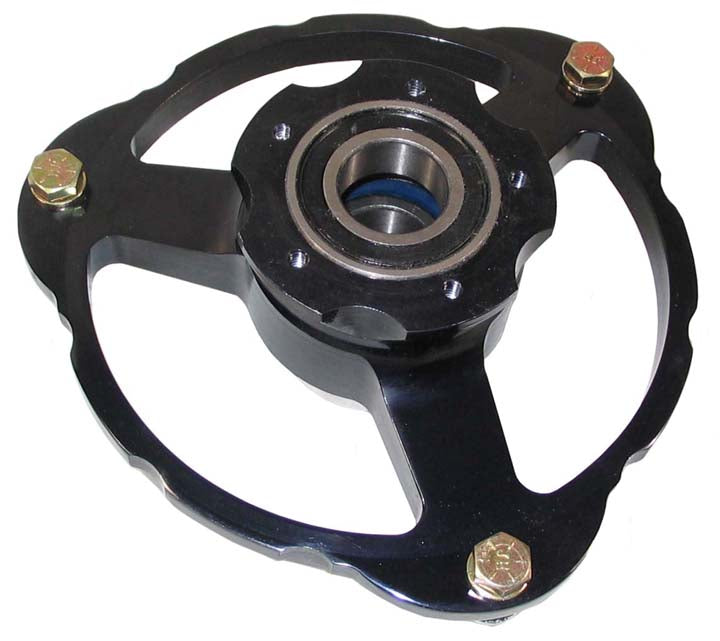 NEW LIGHTWEIGHT, 3-SPOKE DESIGN FOR 10" DIAMETER, 12-BOLT WHEELS HAS ROTOR ADAPTER HOLES FOR LEFT FRONT BRAKE ROTOR BLACK ANODIZED INCLUDES 2 BEARINGS & DUST CAP USED FOR DIRECT MOUNT FRONT HUBS ON MOST POPULAR 600CC MICRO SPRINT CHASSIS