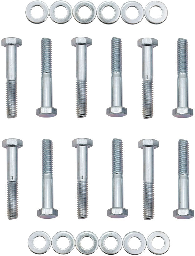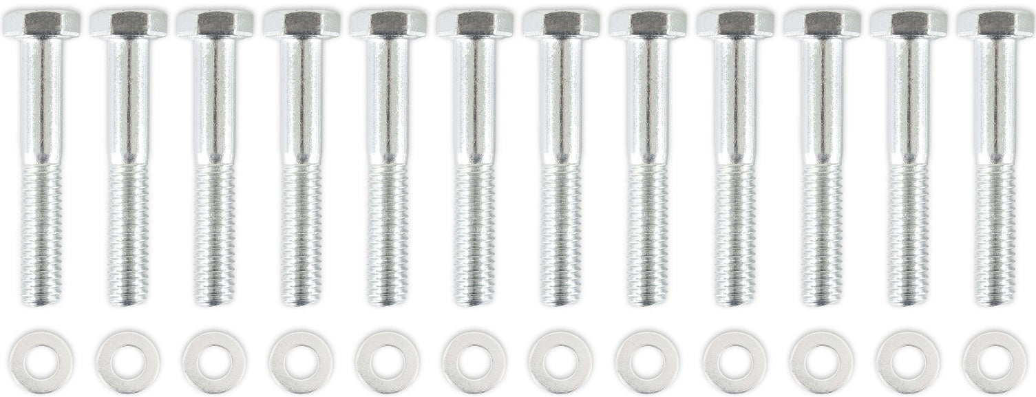 THESE GRADE 5 HEX HEAD BOLTS ARE ZINC PLATED FOR PROTECTION AND APPEARANCE. HARDENED FLAT WASHERS PROVIDE UNIFORM TORQUE & PREVENT GALLING ON ALUMINUM MANIFOLDS. INCLUDES TWELVE (12) 5/16 INCH-18 X 2 INCH BOLTS & WASHERS.