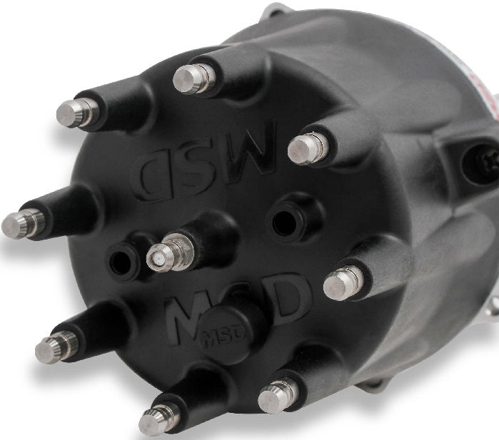 MSD MOST POPULAR PERFORMANCE DISTRIBUTOR IS NOW AVAILABLE WITH A BLACK CAP THAT INCLUDES 316 STAINLESS STEEL TERMINALS. THE HOUSING IS MACHINED FROM A BILLET OF 6061-T6 ALUMINUM ON A STATE OF THE ART CNC MACHINE PRODUCING EXACT TOLERANCES. FOR HIGH RPM STABILITY, A .500" STEEL SHAFT IS SUPPORTED BY A SEALED BALL BEARING AND A LONG SINTERED BUSHING.