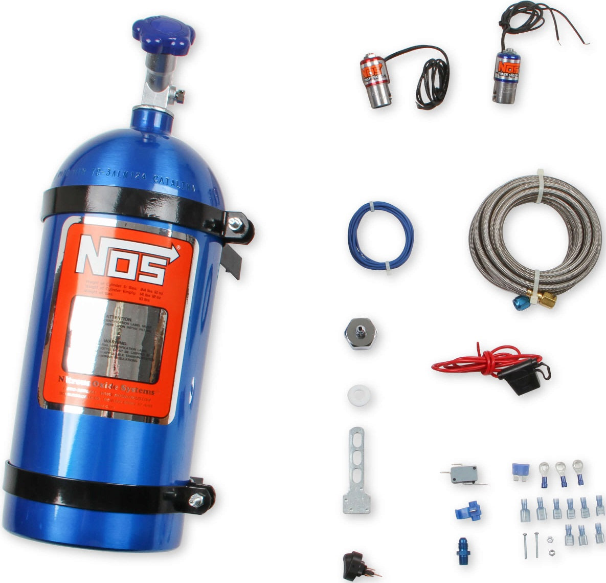 THE UNIVERSAL NOS "POWERSHOT" NITROUS SYSTEM IS SUPPLIED WITHOUT AN INJECTOR PLATE TO ALLOW FOR A CUSTOM INSTALLATION. SUPPLIED WITH A 10 LB BOTTLE.