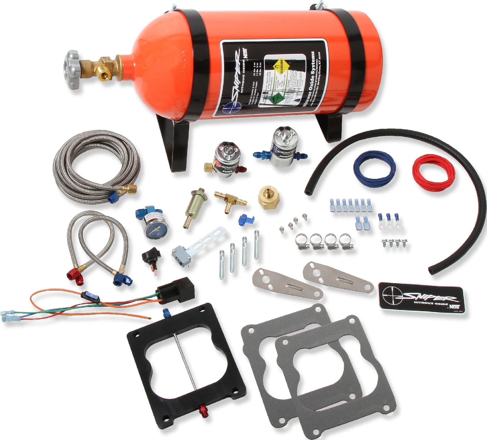 BRAND NEW NOS SNIPER WET NITROUS PLATE KIT, 150-250 HORSEPOWER, 10 LB ORANGE BOTTLE, COMPATIBLE WITH QUADRAJET, THERMOQUAD, HOLLEY SPREAD BORE CARBURETORS & SNIPER EFI SYSTEMS