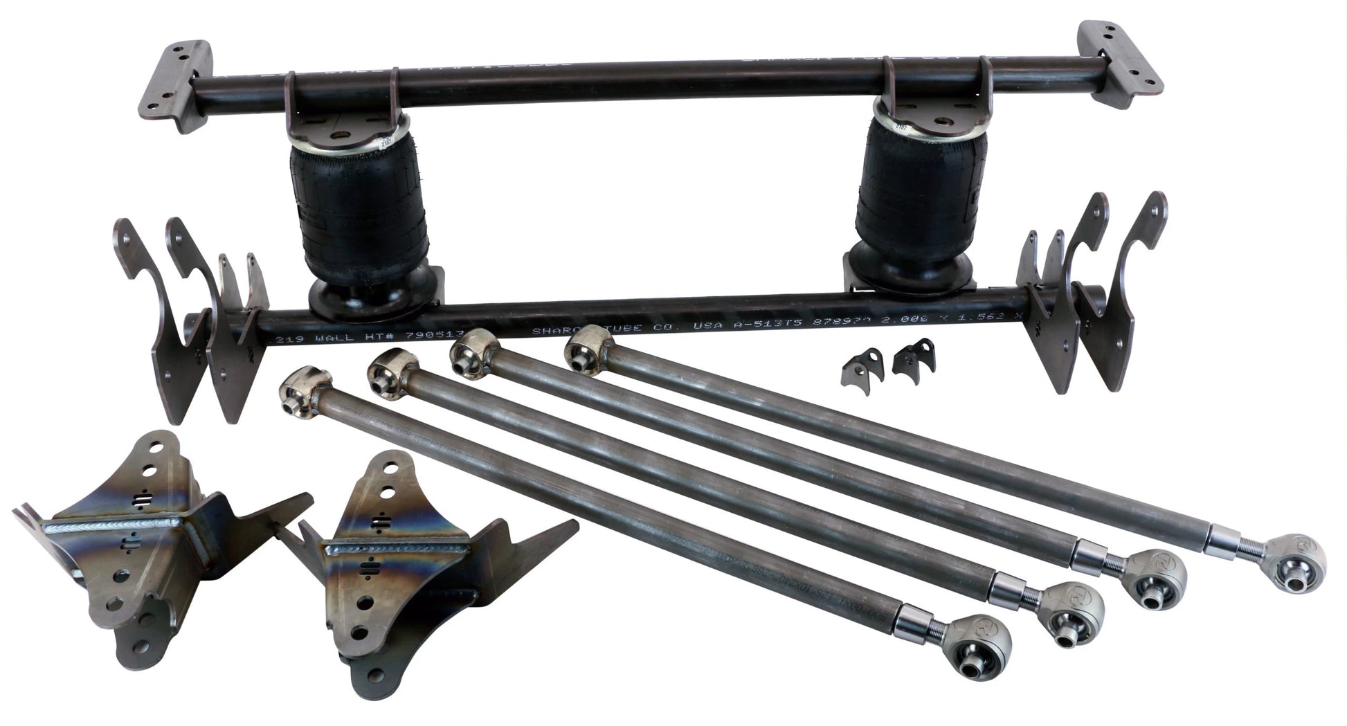 THE HD 4-LINK FEATURES 1.5" DIAMETER .188" WALL DOM TUBE 4-LINK BARS, THE R-JOINT XL ROD ENDS, 2" DIAMETER .250" WALL TUBING BRIDGE, .250" THICK PLATE STEEL BRACKETS, AND FIRESTONE AIRSPRINGS WITH A TOTAL LOAD CAPACITY OF AROUND 7,000 LBS.