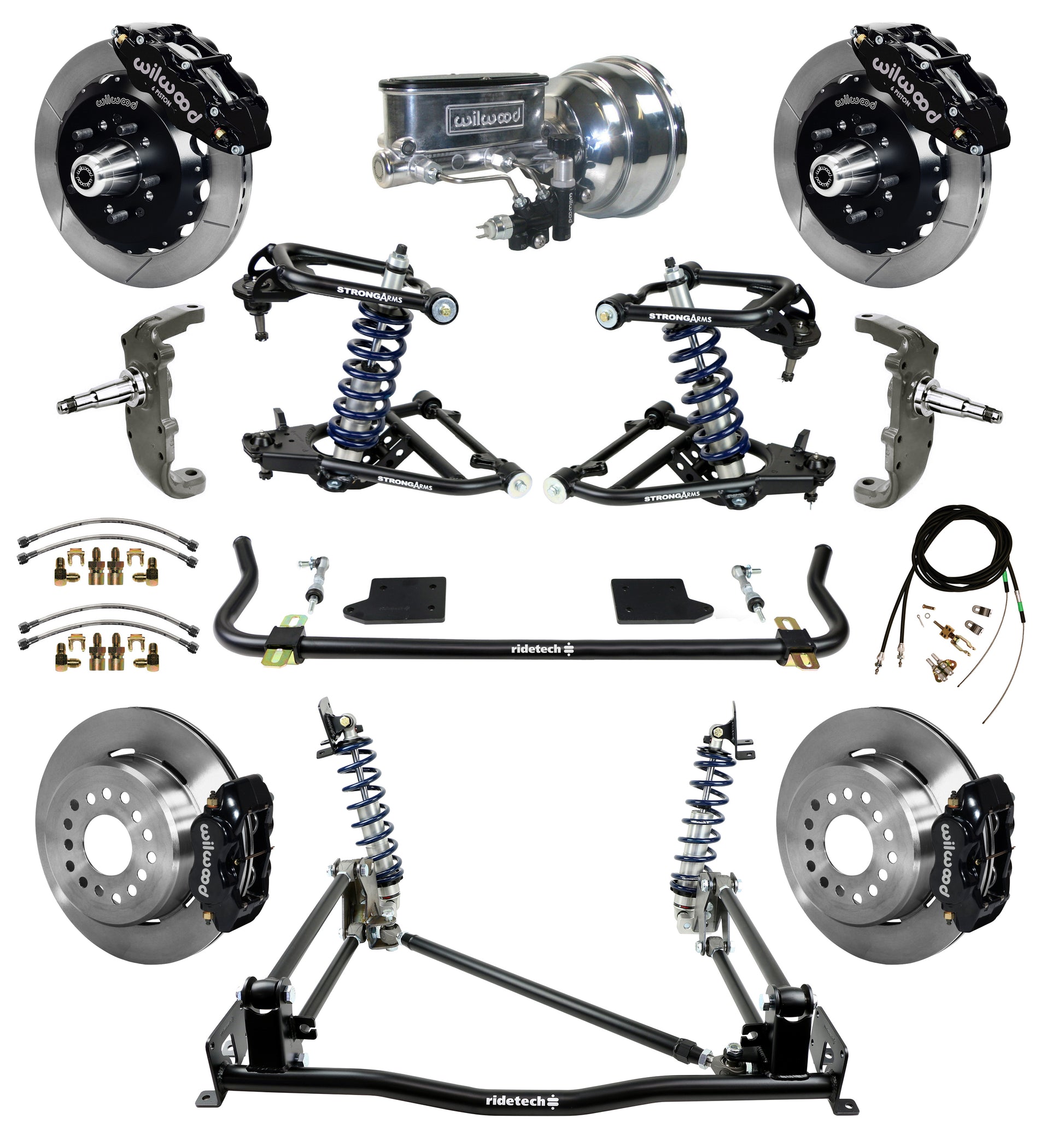 BRAND NEW RIDETECH COILOVER & 4-LINK SYSTEM AND WILWOOD DISC BRAKE KIT, INCLUDING CONTROL ARMS, SPINDLES, MUSCLEBAR FRONT SWAY BAR, 13" FRONT & 12" REAR ROTORS, BRAKE CALIPERS, POWER BRAKE BOOSTER, MASTER CYLINDER, PROPORTIONING VALVE, BRAKE LINES, PARKING BRAKE CABLE KIT, AND MORE (RIDETECH PART #11030201-31).