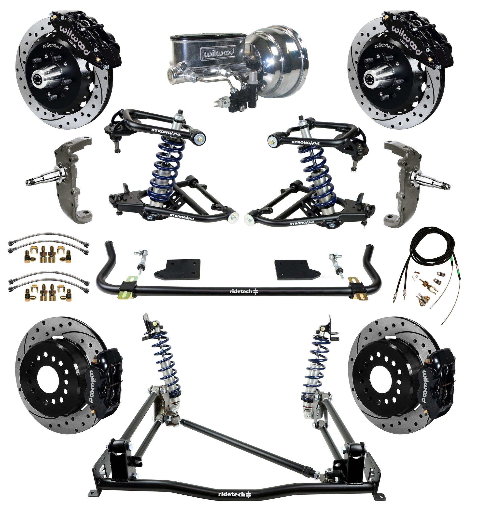 BRAND NEW RIDETECH COILOVER & 4-LINK SYSTEM AND WILWOOD DISC BRAKE KIT, INCLUDING CONTROL ARMS, SPINDLES, MUSCLEBAR FRONT SWAY BAR, 13" FRONT & 12" REAR DRILLED ROTORS, BRAKE CALIPERS, POWER BRAKE BOOSTER, MASTER CYLINDER, PROPORTIONING VALVE, BRAKE LINES, PARKING BRAKE CABLE KIT, AND MORE (RIDETECH PART #11030201-33).