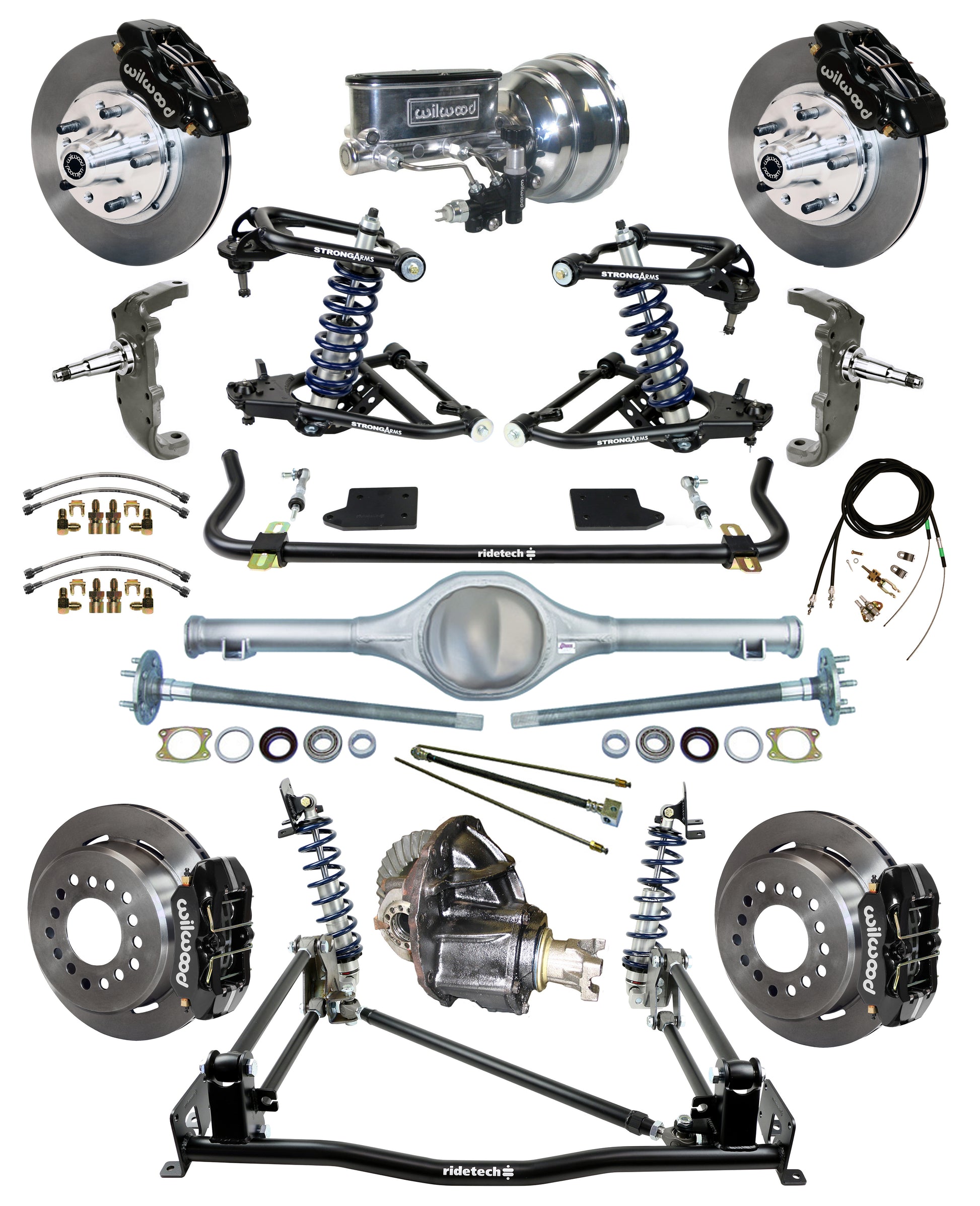 BRAND NEW RIDETECH COILOVER & 4-LINK SYSTEM WITH CURRIE 9" FORD REAR END, SOUTHWEST SPEED POSI-TRAC 3RD MEMBER, AND WILWOOD DISC BRAKES, INCLUDING CONTROL ARMS, SPINDLES, MUSCLEBAR FRONT SWAY BAR, 11" ROTORS, BRAKE CALIPERS, POWER BRAKE BOOSTER, MASTER CYLINDER, PROPORTIONING VALVE, BRAKE LINES, PARKING BRAKE CABLE KIT, AND MORE (PART #11030201-51).
