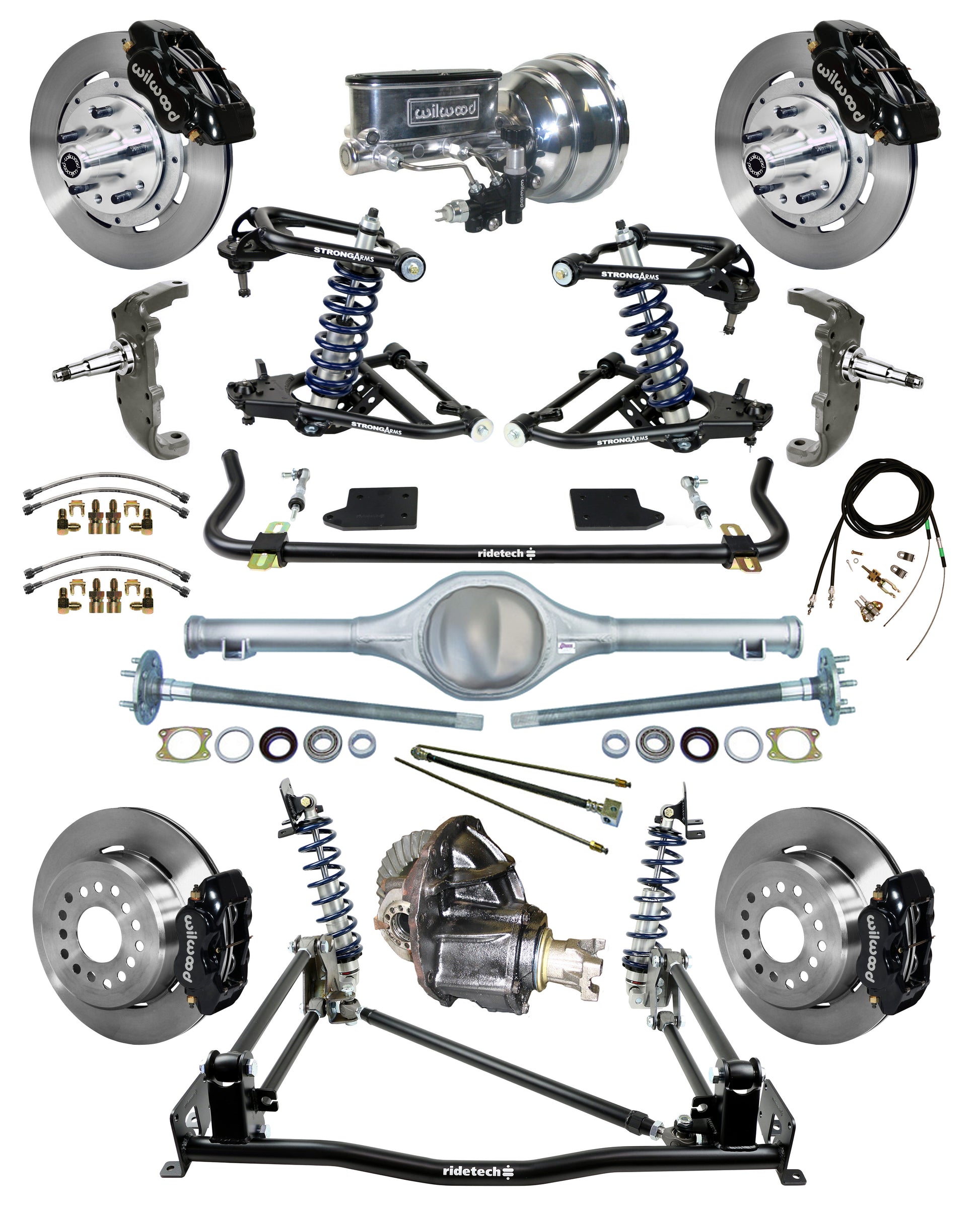 BRAND NEW RIDETECH COILOVER & 4-LINK SYSTEM WITH CURRIE 9" FORD REAR END, SOUTHWEST SPEED POSI-TRAC 3RD MEMBER, AND WILWOOD DISC BRAKES, INCLUDING CONTROL ARMS, SPINDLES, MUSCLEBAR FRONT SWAY BAR, 12" ROTORS, BRAKE CALIPERS, POWER BRAKE BOOSTER, MASTER CYLINDER, PROPORTIONING VALVE, BRAKE LINES, PARKING BRAKE CABLE KIT, AND MORE (PART #11030201-61).